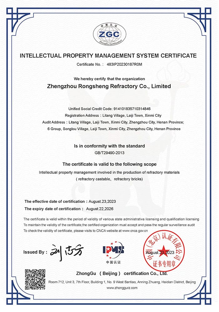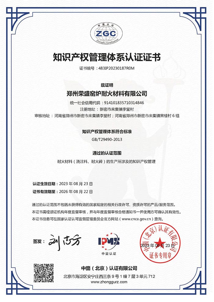 近日,鄭州榮盛窯爐耐火材料有限公司(以下簡(jiǎn)稱「榮盛耐材」)順利通過(guò)知識(shí)產(chǎn)權(quán)貫標(biāo),并獲得了《知識(shí)產(chǎn)權(quán)管理》中英文雙語(yǔ)。該項(xiàng)的順利通過(guò),標(biāo)志著榮盛耐材構(gòu)建了一套規(guī)范化、系統(tǒng)化、程序化、精細(xì)化的知識(shí)產(chǎn)權(quán)管理。