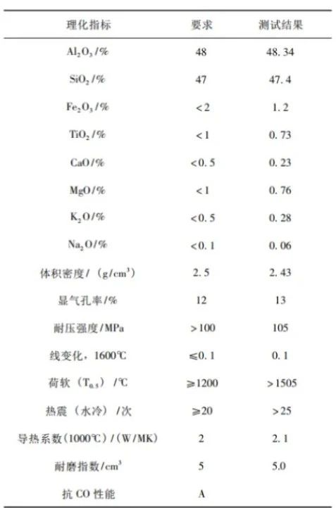 沸騰氯化爐內(nèi)襯材料主要采用Al?O?和SiO?,物相組成主要為莫來石,主要化學(xué)成份及物理性能測(cè)試見表1。