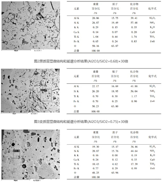 從熱力學(xué)上看,Al?O?-SiO?系材料[4]各物相在氯化反應(yīng)中:莫來石相(A?S?)非常不穩(wěn)定,其成份見表2,石英相(SiO?)非常穩(wěn)定,剛玉相(Al?O?)居中;在碳熱還原中:石英相非常不穩(wěn)定,剛玉相非常穩(wěn)定,莫來石相居中。在實(shí)際中,爐襯材料是如何損壞的,其過程是怎樣發(fā)生的,這要從殘磚顯微結(jié)構(gòu)分析入手。
