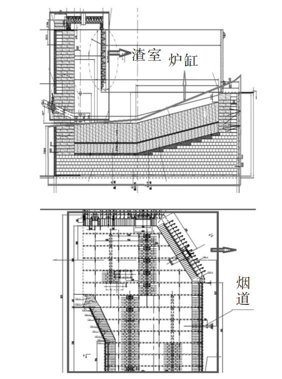 由側(cè)吹爐工作原理可知,側(cè)吹爐爐缸、渣室會受到熔體的侵蝕和沖刷,煙道會受少量熔渣的噴溉侵蝕和含塵煙氣的沖刷。在正常爐況下,這3個區(qū)域的溫度為1100~1300℃;但在爐況不穩(wěn)定情況下,這3個區(qū)域的溫度可達1400℃以上。在實際生產(chǎn)過程中,側(cè)吹爐需供入富氧1次風和2次風,并在局部形成強氧化氣氛,因此側(cè)吹爐應選擇不易被氧化的耐火磚。熔渣的主要成分為FeO、SiO?、CaO、AI?O?,高鋁質(zhì)耐火材料和硅石耐火材料會參與造渣,不適合側(cè)吹爐使用。因此,側(cè)吹爐耐火材料需要具備耐高溫、熱穩(wěn)定性強、荷重變形溫度高、耐壓強度高、抗氧化性、不參與造渣的特點。結(jié)合耐火材料的特性,側(cè)吹爐應選擇鎂質(zhì)耐火材料。鎂質(zhì)耐火材料中Cr?O?的含量増加可以提高材料的抗渣侵蝕性,因此側(cè)吹爐爐缸、渣室和煙道的耐火磚選擇Cr?O?含量較高的鎂鉻質(zhì)耐火材料。