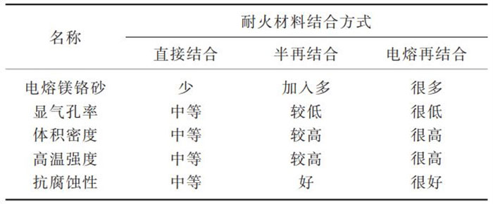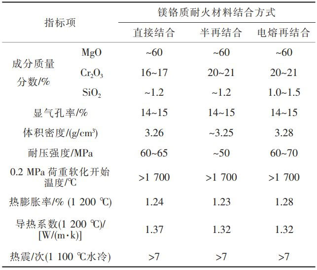 根據(jù)鎂鉻質(zhì)耐火材料的結(jié)合形式的不同,包括直接結(jié)合、半再結(jié)合、電熔再結(jié)合等鎂鉻質(zhì)耐火材料。其中,直接結(jié)合鎂鉻質(zhì)耐火材料是以高純燒結(jié)鎂砂和鉻鐵礦為原料,將電熔鎂砂與鉻礦直接燒結(jié);半再結(jié)合鎂鉻質(zhì)耐火材料是以電熔鎂鉻砂作屬粒,加入部分鉻礦和鎂砂或燒結(jié)合成鎂鉻料作細粉,高溫燒結(jié)而成;電熔再結(jié)合鎂鉻質(zhì)耐火材料是將鉻礦與電熔鎂砂在電爐中電熔,制得電熔鎂鉻砂,再高溫燒結(jié)而成。3類鎂鉻質(zhì)耐火磚材料特性對比,見表1。