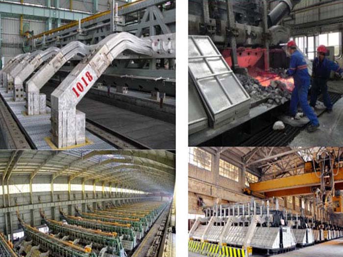 鋁電解槽通常為矩形鋼殼,內(nèi)襯碳磚。電解槽中懸有一碳陽ji,其碳質(zhì)槽底為陰ji。電解還原出來的金屬鋁熔體沉積于槽底陰ji。陽ji放出的氧與碳陽ji反應(yīng)生成CO與CO2。槽內(nèi)電解質(zhì)與鋁保持熔融狀態(tài),隔一定時(shí)間從槽內(nèi)放出鋁液,并向槽內(nèi)加入一定量的Al2O3與冰晶石(3NaF.AlF3)等。電解溫度為900~1000℃。