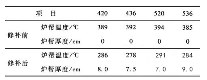 電解槽側(cè)部?jī)?nèi)襯破損部位修補(bǔ)前后爐幫溫度及爐幫厚度的測(cè)量對(duì)比分析結(jié)果見表2。