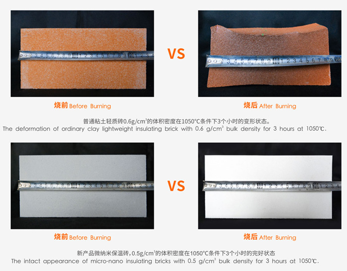 將體積密度0.6 g/cm3的普通粘土質(zhì)輕質(zhì)保溫磚和體積密度0.5 g/cm3的微納米保溫磚同時在1050℃下保溫3小時燒后,普通粘土質(zhì)輕質(zhì)保溫磚由230mm收縮到190mm,磚體嚴重變形,而新型保溫磚尺寸未發(fā)生變化,外觀完好。